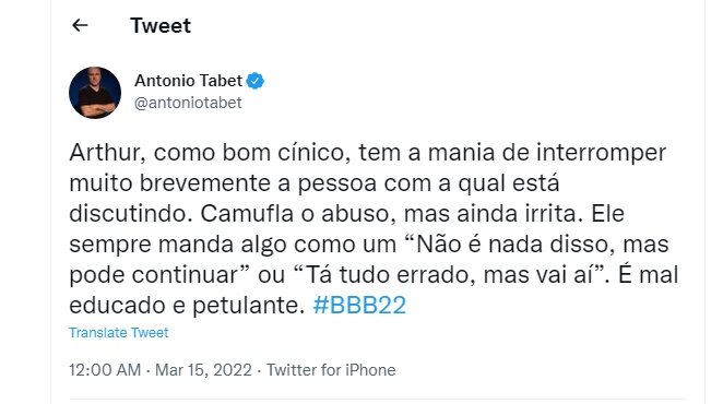 Na noite da última segunda-feira, 14 Aguiar participou do tradicional jogo da discórdia no BBB22, que acontece toda semana, sendo assim o humorista do Porta dos Fundos, Antono Tabet parece não ter gostado da participação do marido de Maira Cardi e chamou o brother de cínico, e disse que ele tem mania de interromper as pessoas o tempo todo.