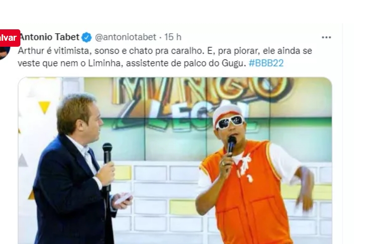 E não parou por aí não, sobrou até para a roupa que Arthur estava vestindo no programa ao vivo. “Arthur é vitimista, sonso e chato pra caralho. E, pra piorar, ele ainda se veste que nem o Liminha, assistente de palco do Gugu”, continuou.