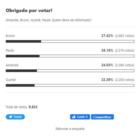 Este site resolveu abrir uma enquete para medir a temperatura do jogo e pontuar quem poderá deixar a atração da emissora dos Marinho. Sendo assim, a parcial revela, até o fechamento dessa matéria, que Bruno Gaga poderá ser o próximo eliminado. O brother aparece com 27,42% (2,693 votos). Logo em seguida, Paula vem como a mais votada, 26.16% (2,570 votos). Amanda possui 24.03% (2,360 votos) e Guimê 22,39% (2,200 votos). Vale lembrar que este é um registro do momento e indica quem possivelmente irá deixar o jogo.