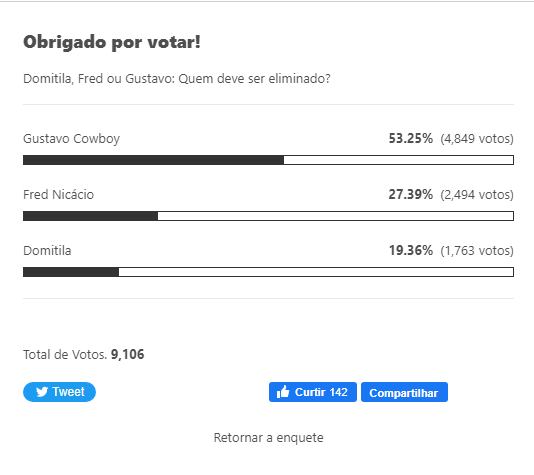 Dessa forma, uma enquete foi realizada neste site para saber quem pode ser o sexto eliminado da atração da emissora dos Marinho. A parcial mostra que Gustavo será o próximo a deixar o reality. Até o momento do fechamento desta matéria foram contabilizados 9,106 votos. O cowboy aparecia com 53.25% (4,849 votos). Enquanto Fred Nicácio possuía 27.39% (2,494 votos). Já Domitila ficava em último lugar com 19.36% (equivalendo a 1,763 votos). Vale lembrar que este percentual expõe um retrato do momento.
