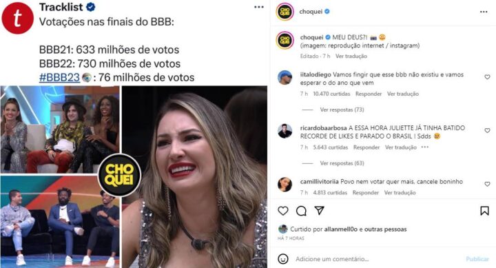 Dessa forma, segundo dados levantados, o BBB23 teve a pior votação de uma final na história do programa. No entanto, se comparado as últimas duas edições 21 e 22, o reality show se torna motivo de piada. Ao todo, a final de BBB23 teve cerca de 76 milhões de votos, algo jamais visto, na era digital.