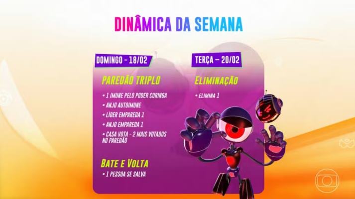 No domingo, 18 de fevereiro, acontece o Paredão Triplo. Um brother estará imune pelo Poder Curinga. O Anjo será autoimune, o Líder irá colocar uma pessoa na berlinda, e o Anjo ainda colocará mais um. Logo na sequência, a casa vota e coloca mais uma pessoa no Paredão. No Bate e Volta, apenas um brother se salva e na terça-feira, 20 de fevereiro, acontece mais uma Eliminação.