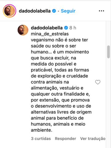 “Tão natureba, tão vegana, e fuma. Dos bichos tem dó e dos próprios pulmões não”, disse um internauta. O ator então respondeu, dizendo que a crueldade contra os animais deveria acabar. “Veganismo não é sobre ter saúde ou sobre o ser humano… é um movimento que busca excluir, na medida do possível e praticável, todas as formas de exploração e crueldade contra animais na alimentação, vestuário e qualquer outra finalidade”, afirmou Dado.