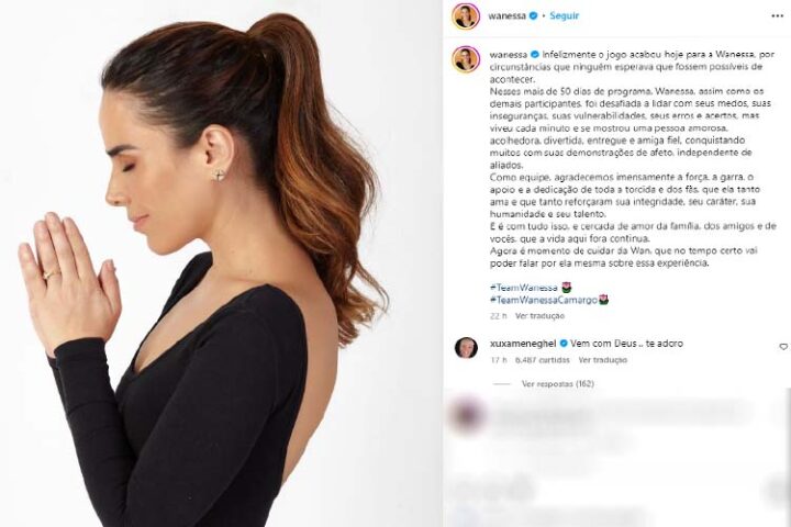 Por fim, disseram ainda que a vida fora do jogo precisa continuar e que Wanessa Camargo irá falar sobre o assunto no momento certo, quando estiver preparada. “E é com tudo isso, e cercada de amor da família, dos amigos e de vocês, que a vida aqui fora continua. Agora é momento de cuidar da Wan, que no tempo certo vai poder falar por ela mesma sobre essa experiência”, completou a equipe no texto.