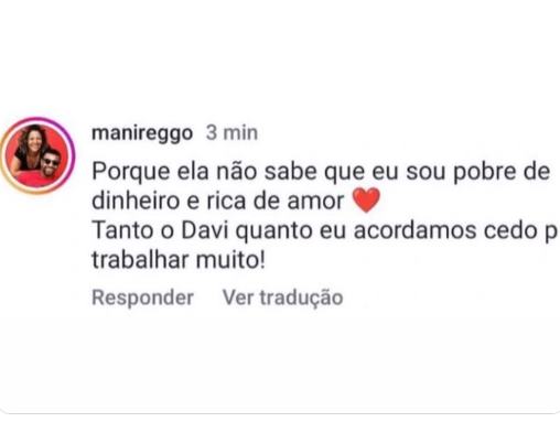 Mani escreveu o seguinte: ”Porque ela não sabe que eu sou pobre de dinheiro e rica de amor. Tanto o Davi quanto eu acordamos cedo para trabalhar muito!”, destacou. E é claro que os internautas não poderiam deixar este momento passar como despercebido. Prontamente, trataram de comentar a situação envolvendo Mani e os demais brothers.