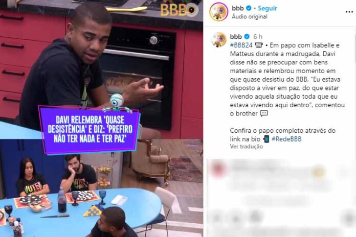 Na grande final do “BBB24“, Davi abriu o jogo sobre o dinheiro e bens materiais, afirmando que prefere ter paz a uma casa cheia de contendas. Em conversa com Isabelle e Matteus, o motorista de aplicativo revelou que quase desistiu da competição, vivendo momentos difíceis durante o confinamento.