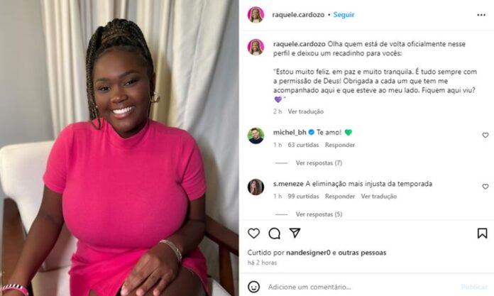 Após deixar o reality show, a ex-sister voltou a usar as redes sociais e posou para uma foto em seu perfil, logo destacando na legenda: “Olha quem está de volta oficialmente nesse perfil e deixou um recadinho para vocês: ‘Estou muito feliz, em paz e muito tranquila. É tudo sempre com a permissão de Deus! Obrigada a cada um que tem me acompanhado aqui e que esteve ao meu lado. Fiquem aqui viu?’“, publicou.