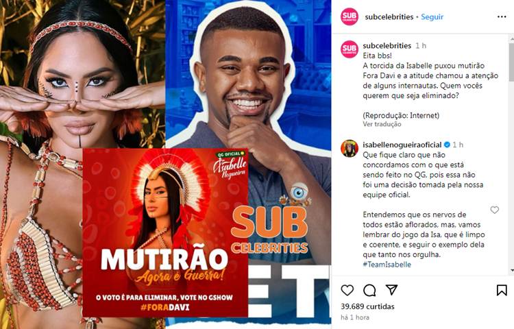 Nos comentários, a equipe de Isabelle esclareceu. “Que fique claro que não concordamos com o que está sendo feito no QG, pois essa não foi uma decisão tomada pela nossa equipe oficial. Entendemos que os nervos de todos estão aflorados, mas, vamos lembrar do jogo da Isa, que é limpo e coerente, e seguir o exemplo dela que tanto nos orgulha. #TeamIsabelle”, justificou a equipe oficial da sister.