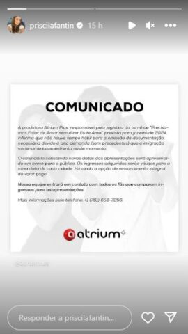 Por meio dos stories no Instagram, Priscila Fantin comunicou aos fãs e amigos, que a sua agenda de início do ano para uma turnê nos EUA, está cancelada e que, em breve, sua equipe revelaria as novas datas. “O calendário constando as novas datas das apresentações será divulgado em breve para o público“, disse ela, ainda, enfatizando que não conseguiu emitir a documentação necessária para levar sua peça ao exterior, em tempo hábil.