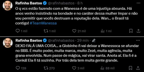 Rafinha admitiu: ”O q vcs estão fazendo com a Wanessa é de uma injustiça absurda. Há anos venho insistindo na bondade e no caráter dessa mulher ímpar e não vou permitir que vocês destruam a reputação dela. Wan… o Brasil tá contigo! #TeamWanessa”, destacou.