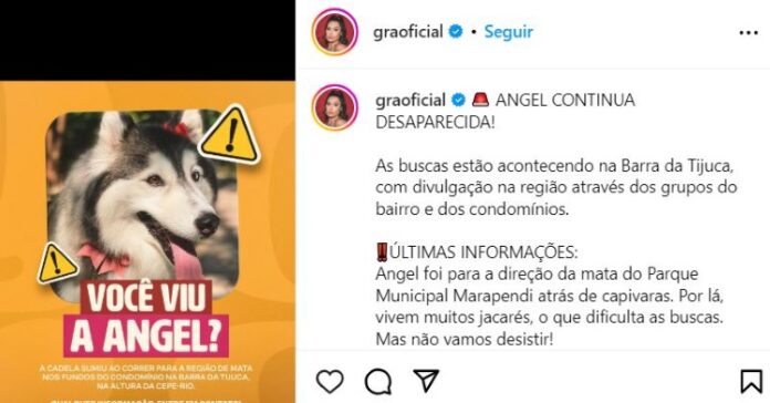 A assessoria da influenciadora anunciou um endereço de e-mail (contato@graoficial.com.br) para que qualquer pessoa que tenha informações sobre o paradeiro de Angel possa avisar.
