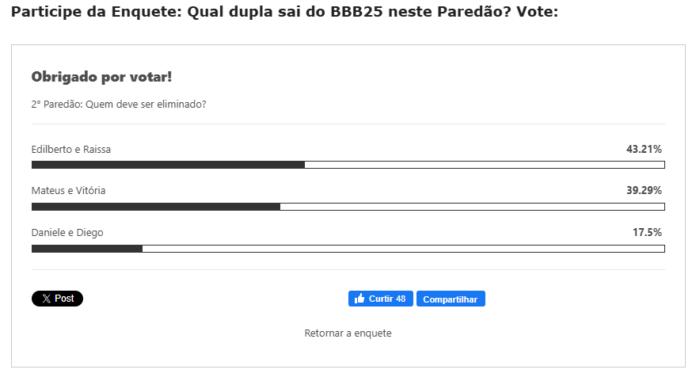 O “BBB25” segue a todo vapor com o segundo Paredão formado na noite deste domingo (26). As duplas Daniele e Diego, Mateus e Vitória, Edilberto e Raissa estão na berlinda da semana.