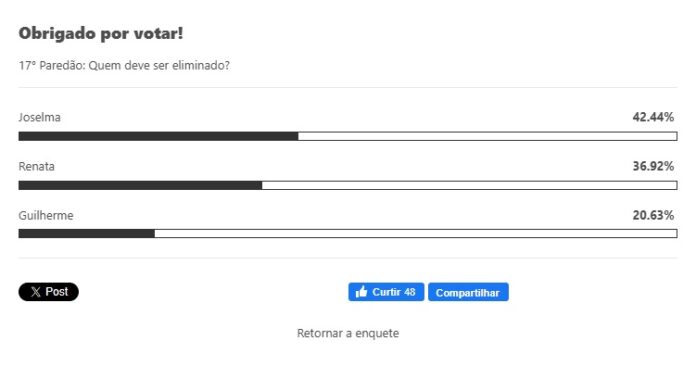Resultado parcial de enquete publicada pelo Área Vip mostra uma disputa acirrada entre as sisters emparedadas. Joselma segue na dianteira, com 42.44% dos votos para deixar o jogo. Logo em seguida, está Renata, com 36.92%. A parcial ainda mostra que, até o momento, Guilherme pode ser o menos votado.