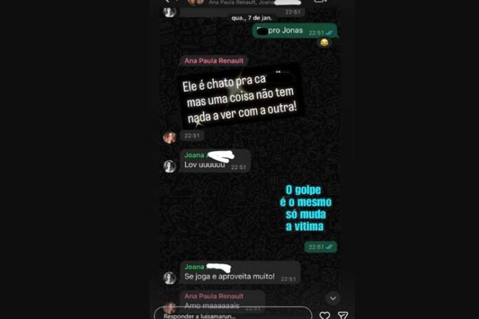 Antes de ser confirmada no “BBB26”, Ana Paula Renault recebeu um pedido curioso envolvendo o seu parceiro de confinamento, Jonas. Na competição, ambos chegaram a flertar em alguns momentos e a sister relembrou do pedido feito por uma amiga via aplicativo de mensagens.
