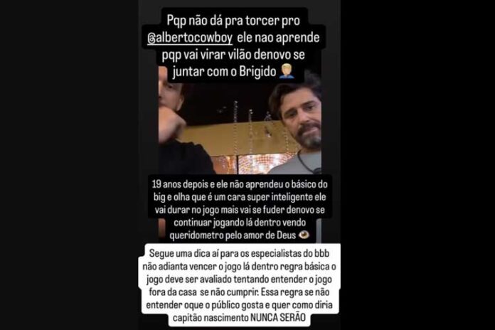 Alberto Cowboy e Diego Alemão foram grandes adversários no “BBB7”. O campeão da edição voltou a comentar sobre o assunto em Stories publicados em seu perfil no Instagram.