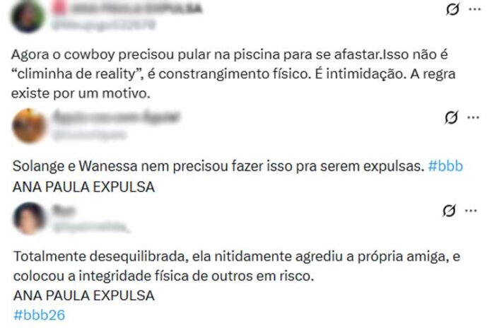 “Totalmente desequilibrada, ela nitidamente agrediu a própria amiga, e colocou a integridade física de outros em risco”, disse outra. “Agora o cowboy precisou pular na piscina para se afastar. Isso não é ‘climinha de reality’, é constrangimento físico. É intimidação. A regra existe por um motivo”, disse mais uma pedindo a expulsão da sister.