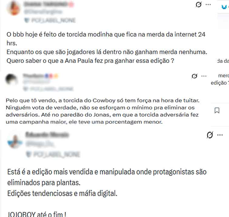 “Pelo que tô vendo, a torcida do Cowboy só tem força na hora de tuitar. Ninguém vota de verdade, não se esforçam o mínimo pra eliminar os adversários. Até no paredão do Jonas, em que a torcida adversária fez uma campanha maior, ele teve uma porcentagem menor”, observou um internauta.