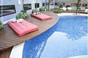 Este ano, os participantes poderão aproveitar o sol e as noites em volta da piscina em espreguiçadeiras de ratan sintético, com almofadas estampadas e listradas, em composé, nas cores preta e branca. Do outro lado da piscina, há dois futons vermelhos e almofadas na mesma padronagem. Perto do hidrospa, duas espreguiçadeiras de ratan sintético em formato de folhas garantem o charme do lugar. Um futon branco com estampa de folhas em preto compõe um cantinho aconchegante para os participantes.
