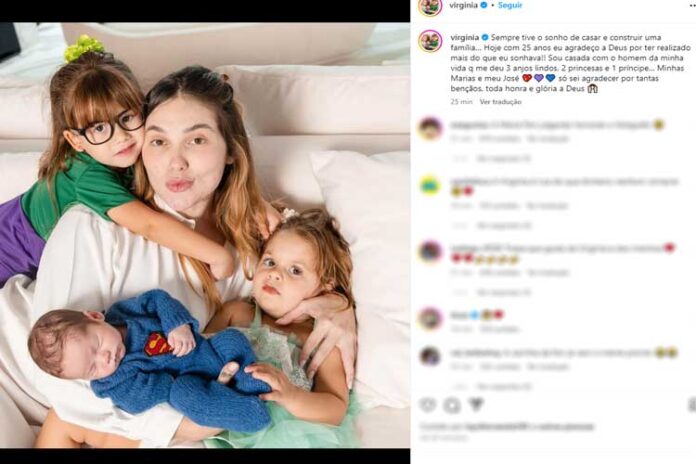 Na imagem, a influenciadora e apresentadora do “Sabadou com Virginia” aparece ao lado das Marias e do pequeno José Leonardo, vestido com um conjuntinho do Superman. “Só sei agradecer por tantas bênçãos, toda honra e glória a Deus”, completou.