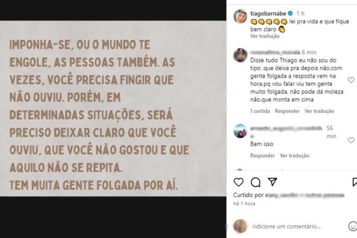 Nesta terça-feira (02), Tiago compartilhou uma mensagem em seu perfil no Instagram vista por muitos como uma indireta. “Impunha-se, ou o mundo te engole, as pessoas também. Às vezes, você precisa fingir que não ouviu. Porém, em determinadas situações, será preciso deixar claro que você ouviu, que você não gostou e que aquilo não se repita. Tem muita gente folgada por aí”, diz o texto.