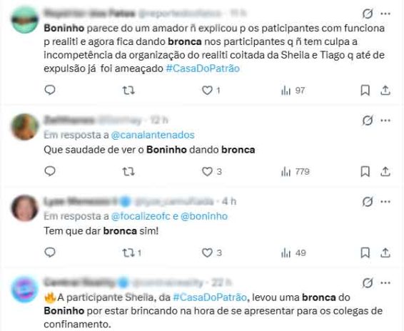 No X (antigo Twitter), vários internautas reagiram a bronca do diretor, já conhecido por outras situações parecidas quando ainda trabalhava na TV Globo. “Que saudade do Boninho dando bronca”, afirmou um internauta. “Tem que dar bronca sim!”, disse outro.