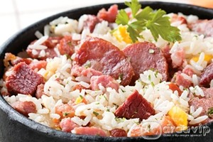Aqueça o azeite em uma panela e frite o bacon. Coloque a lingüiça fatiada e frite. Junte o alho e a cebola e refogue. Acrescente o tomate picado e a carne seca cozida e desfiada. Cozinhe por alguns minutos. Agregue o arroz lavado e escorrido. Adicione a água quente. Cozinhe até secar a água. Desligue. Polvilhe com cebolinha verde.