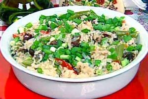-Cozinhe até secar a água (cerca de 23 minutos). Coloque em um refratário. Polvilhe com salsa e cebolinha.