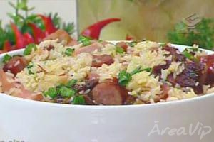 – Em uma frigideira funda, aqueça o óleo e frite o toucinho. Junte o lombo cortado em cubos e a linguiça. Deixe fritar. Coloque o alho, a cebola e a pimenta (opcional). refogue. acrescente o arroz, a carne seca cozida previamente, a água quente e cozinhe por aproximadamente 11 a 15 minutos (até secar e ficar "al dente"). Desligue. Decore com cebolinha e salsinha.
