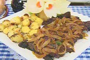 – Coloque o baby beef em um refratário e tempere com ervas finas, alho, sal, pimenta e vinho. Misture previamente. Deixe no tempero por 2 horas (para pegar gosto). A seguir, derreta a margarina em uma panela e frite o baby beef de todos os lados. Junte o caldo do tempero e cozinhe em fogo baixo. Conforme for secando, acrescente água quente aos poucos. Cozinhe por aproximadamente 2 horas (até amolecer). Retire a carne e acomode em um refratário. Na mesma panela, frite as cebolas fatiadas por alguns minutos (cerca de 5 minutos. Sirva com a carne.