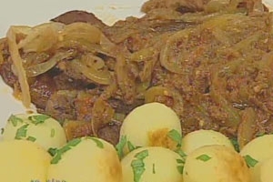 – Acrescente na panela as cebolas e os tomates em rodelas. Mexa. Coloque novamente os bifes e cozinhe por mais alguns minutos. Desligue.