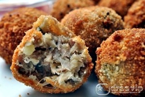 Cozinhe até desgrudar da panela (aproximadamente 4 minutos). Junte a cebolinha verde, misture e retire do fogo. Coloque em um recipiente e deixe esfriar um pouco. Abra porções da massa na palma da mão e empregue o recheio de queijo ou de linguiça calabresa frita (recheios opcionais). Após rechear, modele uma bolinha. Passe pelas claras levemente batidas e a farinha de rosca com queijo ralado (misturados previamente). Frite em óleo não muito quente. Retire do fogo e escorra.