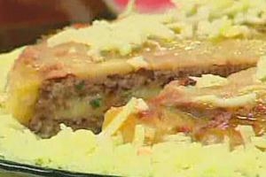 – A seguir, espalhe parte da carne sobre uma assadeira redonda untada com óleo. Distribua o recheio de tomate.
