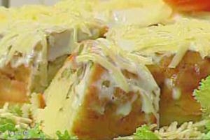 – Na vasilha da batedeira coloque os ovos e bata. Adicione a fécula, a farinha e a manteiga. Torne a bater. Com a batedeira ligada acrescente o leite aos poucos. Desligue e junte o sal e o queijo. Bata. Agregue o fermento em pó e o recheio. Coloque em uma assadeira redonda de buraco no centro untada e polvilhada. Leve ao forno pré aquecido 180°C por 30 a 35 minutos. Desenforme. Deixe esfriar. Espalhe o requeijão cremoso e sobre ele o queijo ralado.