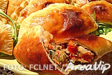 A seguir, abra porções da massa sobre superfície enfarinhada. Modele com cortador redondo. Empregue o recheio de bacalhau ou de carne seca. Aperte as bordas com a ponta do garfo.