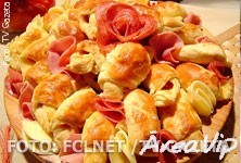 Modele triângulos com um cortador ou com auxílio da faca. Empregue o recheio de presunto e mussarela. Enrole, começando pela parte maior do triângulo. Coloque em uma assadeira retangular untada e polvilhada. Pincele com a gema. Deixe dobrar de volume. Leve ao forno pré-aquecido (180°C) por 25 minutos.