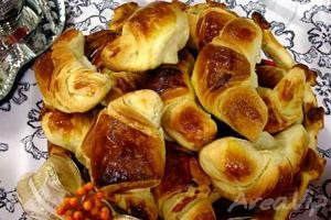 – Em um recipiente esfarele o fermento e adicione o sal. Mexa até obter um líquido. Em um recipiente coloque a farinha (reserve um pouco), ovos levemente batidos, manteiga, raspas de limão e o fermento reservado. Misture para se agregarem (neste momento, se necessário utilize a farinha reservada). Sove sobre a superfície lisa. Coloque dentro de um saco plástico e leve por 30 a 40 minutos na geladeira. A seguir, abra com auxílio do rolo. Espalhe a 2ª massa. Dobre e polvilhe farinha. Abra a massa novamente. Repita a operação por 2 a 3 vezes. Modele um triângulo com cortador ou com a faca. Enrole começando pelo lado maior. Acomode em assadeira untada e polvilhada. Deixe dobrar de volume +- 30 minutos. Pincele gema. Leve ao forno pré aquecido 180°C por cerca de 25 a 30 minutos.