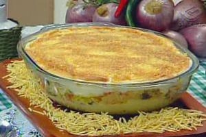 -Em um recipiente unte com manteiga. Coloque o purê. Sobre ele, espalhe o recheio de bacalhau. A seguir, distribua a cobertura. Polvilhe queijo ralado. Leve ao forno pré aquecido a 180 °C por 14 minutos (até dourar).
