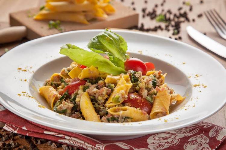 – Escorrer o garganelli, juntar no ragù saltear e perfumar com uma pitada de curry, tomate cereja cortado ao meio, queijo parmesão e salsinha triturada, raspa e suco de um limão siciliano, misturar e servir.