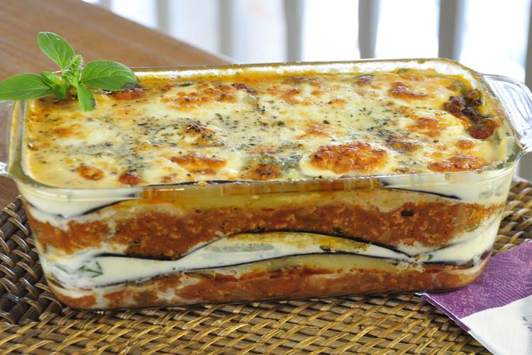 – Retire as fatias de berinjela do forno para montar a lasanha. Use uma travessa pequena para montar. Comece com uma base de carne moída, depois as fatias de berinjela, espinafre com requeijão, muçarela de búfala, parmesão ralado, depois refaça a camada começando com as fatias de berinjela e vá repetindo até encher a travessa, terminando com muçarela de búfala por cima. Finalize com queijo parmesão ralado e orégano. Leve ao forno para o queijo gratinar.