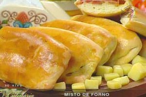 – Após descansar abra porções na massa com o rolo. Recheie com 2 fatias de presunto, rodelas de tomate previamente temperados com azeite e orégano a gosto e 2 fatias de mussarela. Feche. Acomode em uma assadeira retangular untada e polvilhada com farinha. Pincele uma gema. Deixe dobrar de volume. Leve ao forno pré aquecido 180ºC por 20 a 30 minutos.