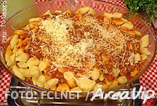 Cozinhe em água fervente até subir na panela. Retire com uma escumadeira e escorra. Coloque em um refratário e regue com o molho. Polvilhe queijo ralado.