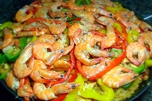 – Adicione as ervilhas, o pimentão vermelho, o caldo de camarão, pimenta, sal e açafrão