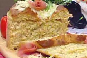 – Mexa para se agregarem. Adicione o peito de peru, o presunto, orégano e a cebolinha verde misturados previamente.