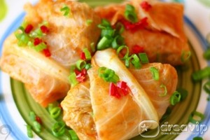 Misture numa vasilha o repolho picado, o tomate, a cebolinha, o arroz, o alho, o iogurte, o peru, o tempero (Aji-no-moto) e o alecrim. Corrija o sal. Suspenda as folhas de repolho segurando-as pelo filme plástico e encaixe-as numa tigela funda. Coloque o recheio na concha de repolho.