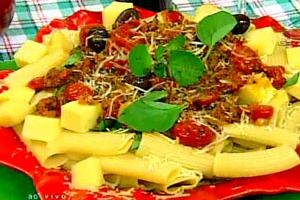 -Em uma panela aqueça o azeite e refogue o alho e a cebola. Junte o molho de tomate e cozinhe por alguns minutos. Acrescente o manjericão, o tomate cereja cortado ao meio, sal e pimenta. Cozinhe por cerca de 12 minutos. Acrescente as azeitonas e continue cozinhando por mais 10 a 12 minutos. Desligue.