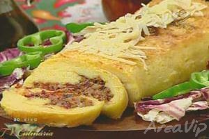 – Em um recipiente coloque a mandioca cozida e espremida, queijo ralado, sal e a farinha aos poucos sempre mexendo com as mãos. A seguir, abra sobre e sob um saco plástico. Espalhe o requeijão sobre a massa e por cima o recheio. Enrole com auxílio do plástico. Após enrolar, retire o plástico e coloque sob papel alumínio. Acomode em uma assadeira retangular. Picele com a gema ou requeijão. Polvilhe queijo ralado. Leve ao forno pré aquecido 180ºC por 15 a 20 minutos.