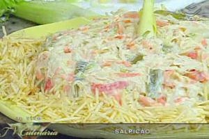 -Em uma tigela coloque o frango cozido e desfiado (não defiar muito), o pimentão verde e vermelho aferventados e a cenoura crua. Mexa. Acrescente cebola e o salsão. Reserve.