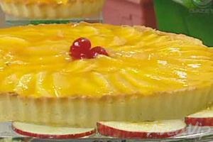 – Em um recipiente misture a farinha, açúcar, manteiga e a gema (se necessário, adicione o leite para dar ponto na massa). Distribua sobre a assadeira redonda n° 24. Leve ao forno pré aquecido 150°C até dourar. A seguir, espalhe o recheio sobre a torta. Distribua fatias de maçãs previamente aferventadas e a cobertura. Decore com cerejas a gosto. Leve para a geladeira.