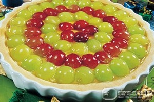 Comece preparando as uvas: corte as uvas ao meio, no sentido do comprimento, e retire as sementes. Reserve. Acrescente o creme de baunilha dentro da massa e espalhe bem com uma colher. Acrescente uma metade de uva, com a parte plana voltada para baixo, uma ao lado da outra, seguindo a circunferência da torta. Cubra toda a superfície da torta. Coloque a geléia de damasco e a água num recipiente e misture bem. Passe a geléia por uma peneira fina. Pincele a geléia sobre as uvas. Sirva a seguir.