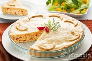 Montagem: divida a massa em 2 partes e abra-as com um rolo. Forre uma forma (23 cm de diâmetro) com uma metade da massa. Coloque o recheio e cubra com a outra metade. Pincele a gema sobre a torta e leve para assar em forno médio (180° C) por 30 minutos ou até que fique dourada.
